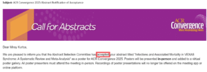 İç Hastalıkları-1 araştırma grubumuz, yürüttükleri bilimsel çalışma ile romatoloji alanının en saygın organizasyonlarından biri olan ACR Convergence tarafından poster sunumu için kabul edildi!